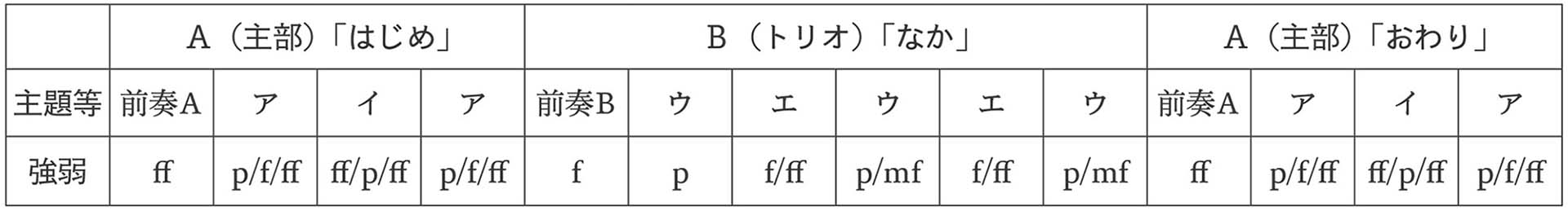 図1は、曲の構成を主題の旋律の反復と強弱の変化で整理したものです。授業ではこれらを分析的に聴くのではなく、指打ちなどの体の動きを通して、感覚的に気付くようにしていきます。また、児童が曲の構成を捉えやすくするために、「A→B→A」を「はじめ→なか→おわり」として提示します。さらに、旋律アの前奏を「用意」、旋律ウの前奏を「つなぎ」とすることで、旋律の変わり目に気付き、A、Bそれぞれの特徴に合う体の動きを工夫できるようにします。