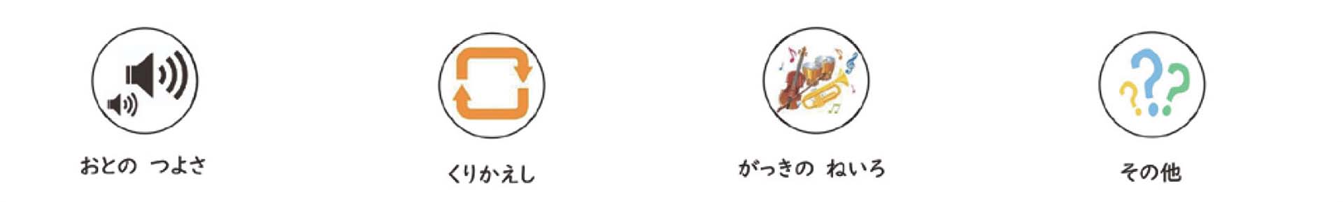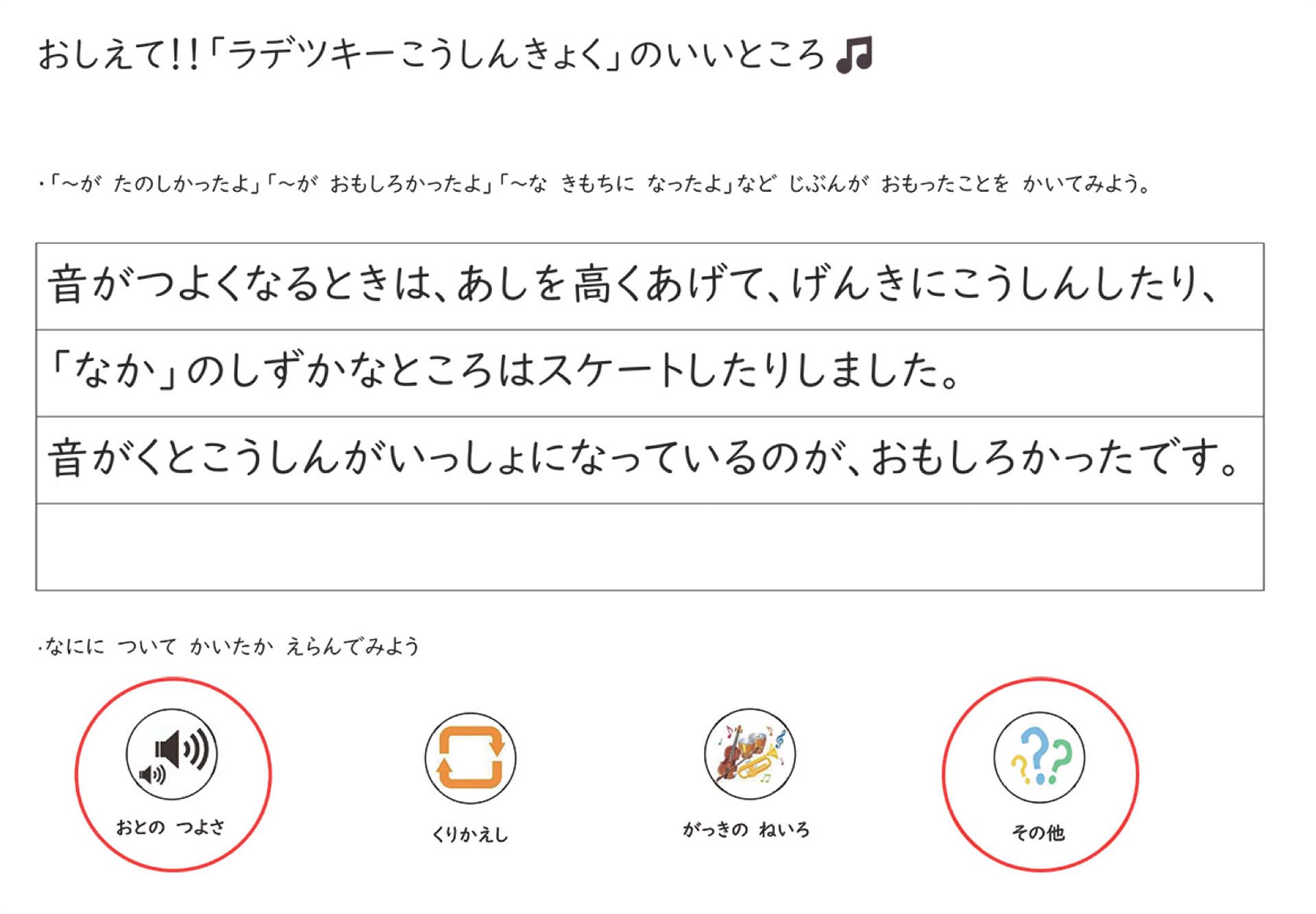 ここのワークシートは、文章を書く欄と上記のマーク欄で構成しています。自分の書いた文章を読み返し、マークに○印をつけることで、何について書いたのか、理解したり確認したりすることができるようにしています。低学年時からこのような活動を行うことで、中学年以降、聴き取ったことと感じ取ったことを分けて書くことにつなげていきます。なお、マークは、児童の思考・判断のよりどころとなる音楽を形づくっている要素を基本としていますが、児童が記入する内容について教師が想定して付け加えたり減らしたりすることが重要です。